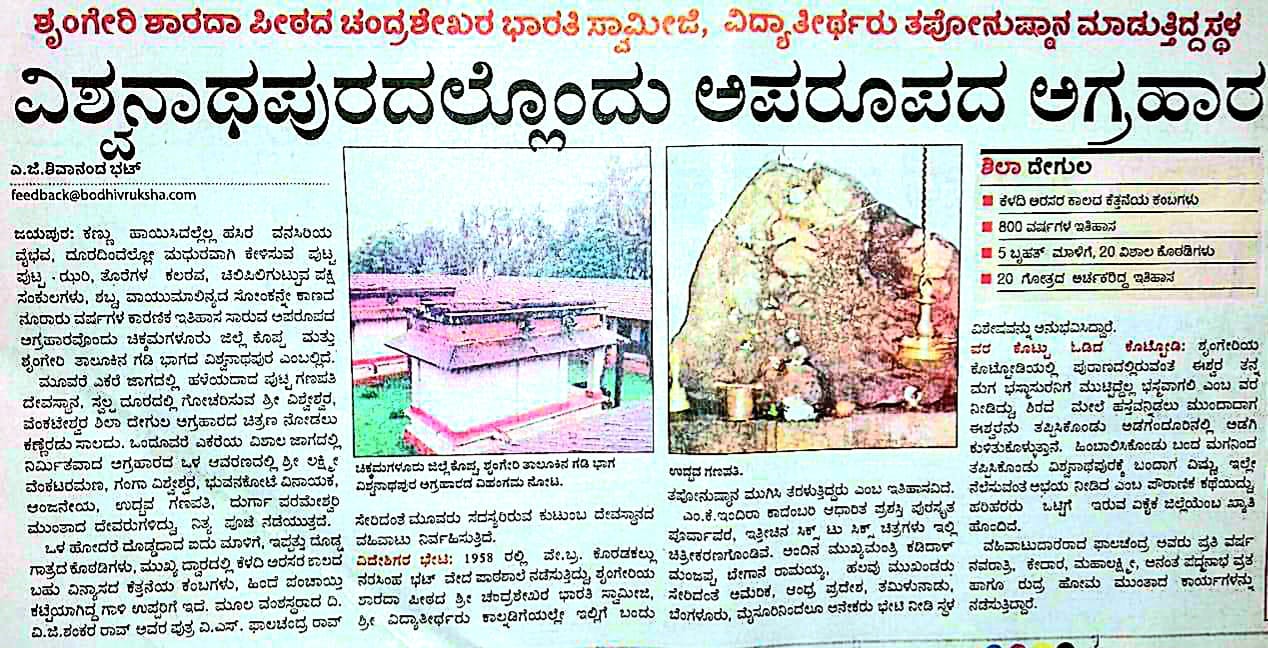 ವಿಶ್ವನಾಥಪುರ ಅಗ್ರಹಾರದಲ್ಲಿ ಏಪ್ರಿಲ್ 29, 2026ನೇ ತಾರೀಕಿನಂದು ಶೃಂಗೇರಿ ಶ್ರೀಜಗದ್ಗುರುಗಳ ದಿವ್ಯ ಸಾನಿಧ್ಯದಲ್ಲಿ ಕುಂಭಾಭಿಷೇಕ ಕಾರ್ಯಕ್ರಮ ನೆಡೆಯಲಿದ್ದು ಹೆಚ್ಚಿನ ಮಾಹಿತಿಗಾಗಿ ಈ ಕೆಳಗೆ ಒತ್ತಿ.